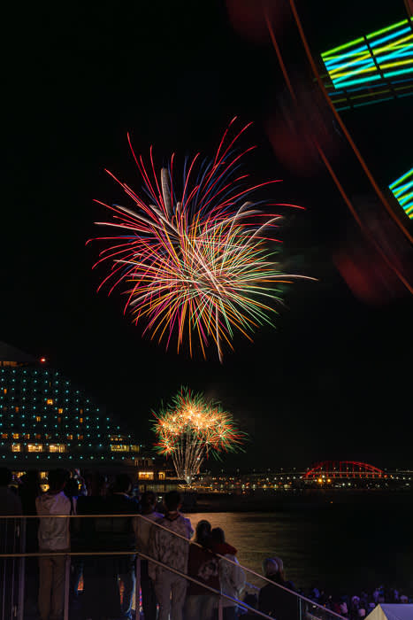계속 돌아가는 관람차와 불꽃. 파인더 너머로 본 순간 “이거다!”라고 생각했습니다. 전경에 관람차를 넣은 세로 구도, 예상 이상의 결과물. 📷