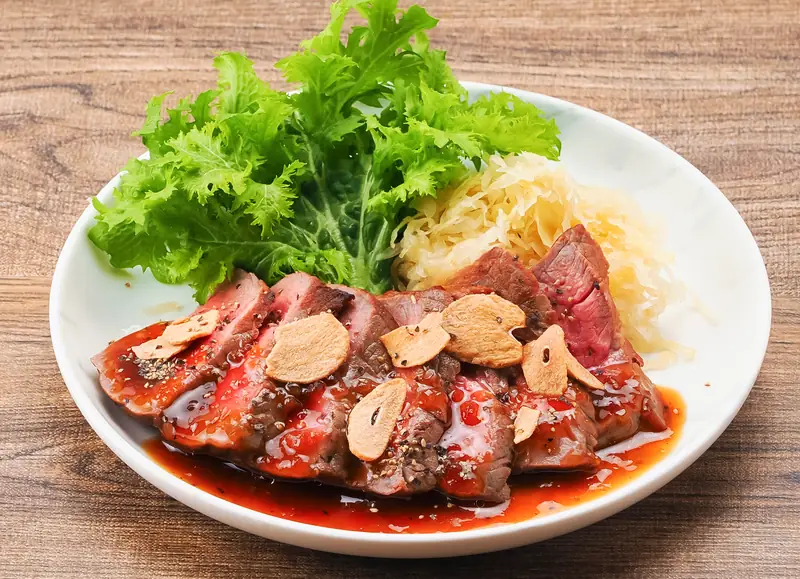 牛腿肉牛排配薯条 焦香大蒜酱 — 香煎牛腿红肉,搭配焦香蒜味酱汁,鲜美十足。
