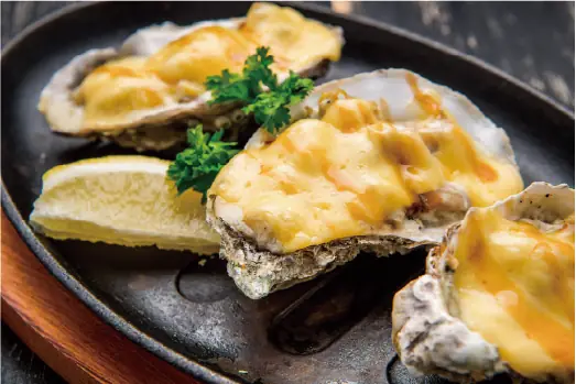 带壳牡蛎 蒜香黄油酱 — 广岛产牡蛎带壳蒸制,淋上香浓蒜香黄油,鲜嫩入味。