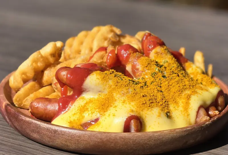 芝士咖喱香肠 — 柏林街头经典小吃,脆嫩香肠配番茄咖喱酱,再加融化芝士,人气No.1。